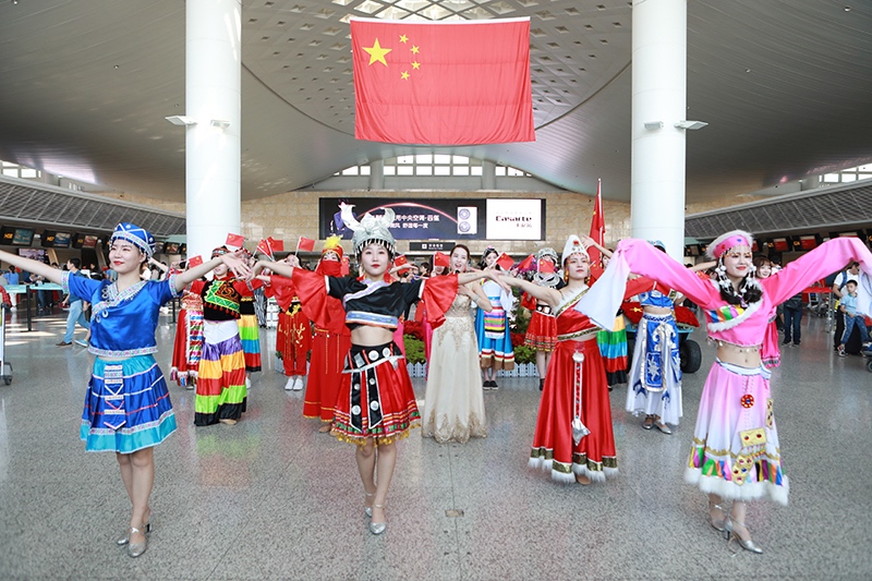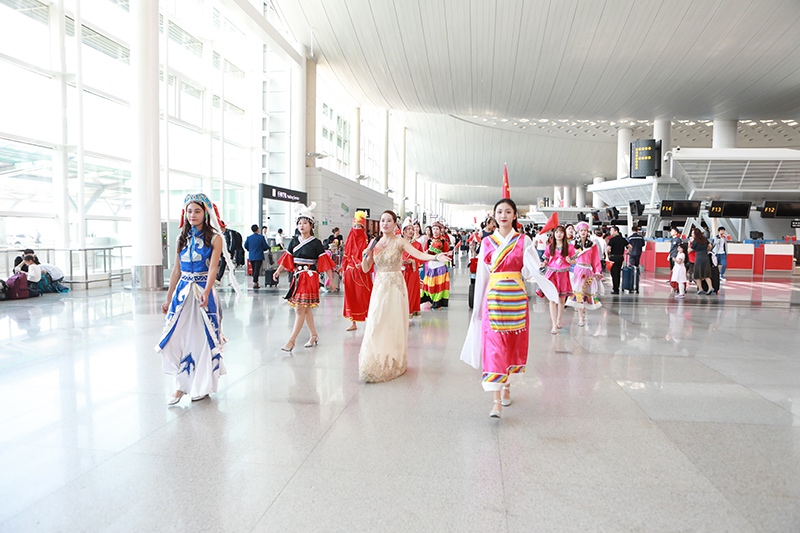為迎接國慶佳節(jié)的到來,紀念祖國成立69周年,10月1日上午10點,航站區(qū)管理中心在3座航站樓開展以“民族團結(jié)-花車歌舞游行展”為主題的文化活動,由中心員工、駐樓商戶員工及演藝人員身著56個民族特色的傳統(tǒng)服飾,伴隨著裝飾了國旗圖案的花車在航站樓出發(fā)大廳內(nèi)進行動態(tài)的游行展示,同時分別在3座航站樓公共區(qū)域表演了旅客們喜聞樂見的愛國歌舞,體現(xiàn)了祖國繁榮昌盛、56個民族團結(jié)富強的偉大盛舉?;顒舆M行的同時,工作人員向過往的旅客分發(fā)了小國旗,并送上節(jié)日祝福,吸引旅客駐足觀賞,紛紛拍照留影。此次活動是航站區(qū)中心第一次在樓內(nèi)舉辦“動態(tài)”的文化活動,通過中秋、國慶兩場文藝演出的成功舉辦,進一步豐富了航站樓的文化元素,提升了航站樓的文化品質(zhì)。