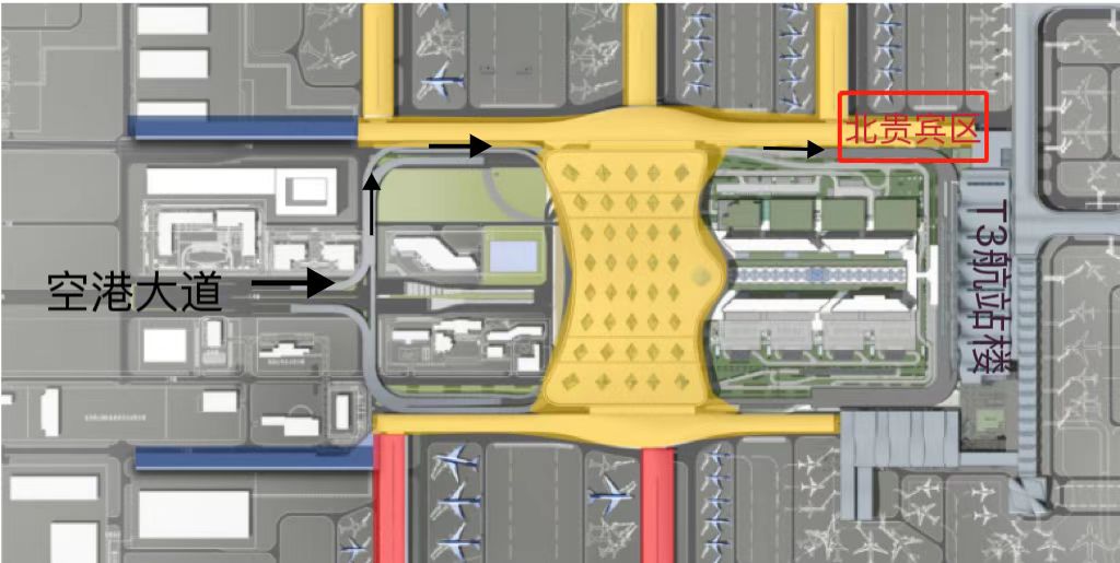 1、北貴賓區:進機場后沿“北貴賓區”指示牌行駛。位于T4航站樓靠近T3航站樓連接處0米層。
