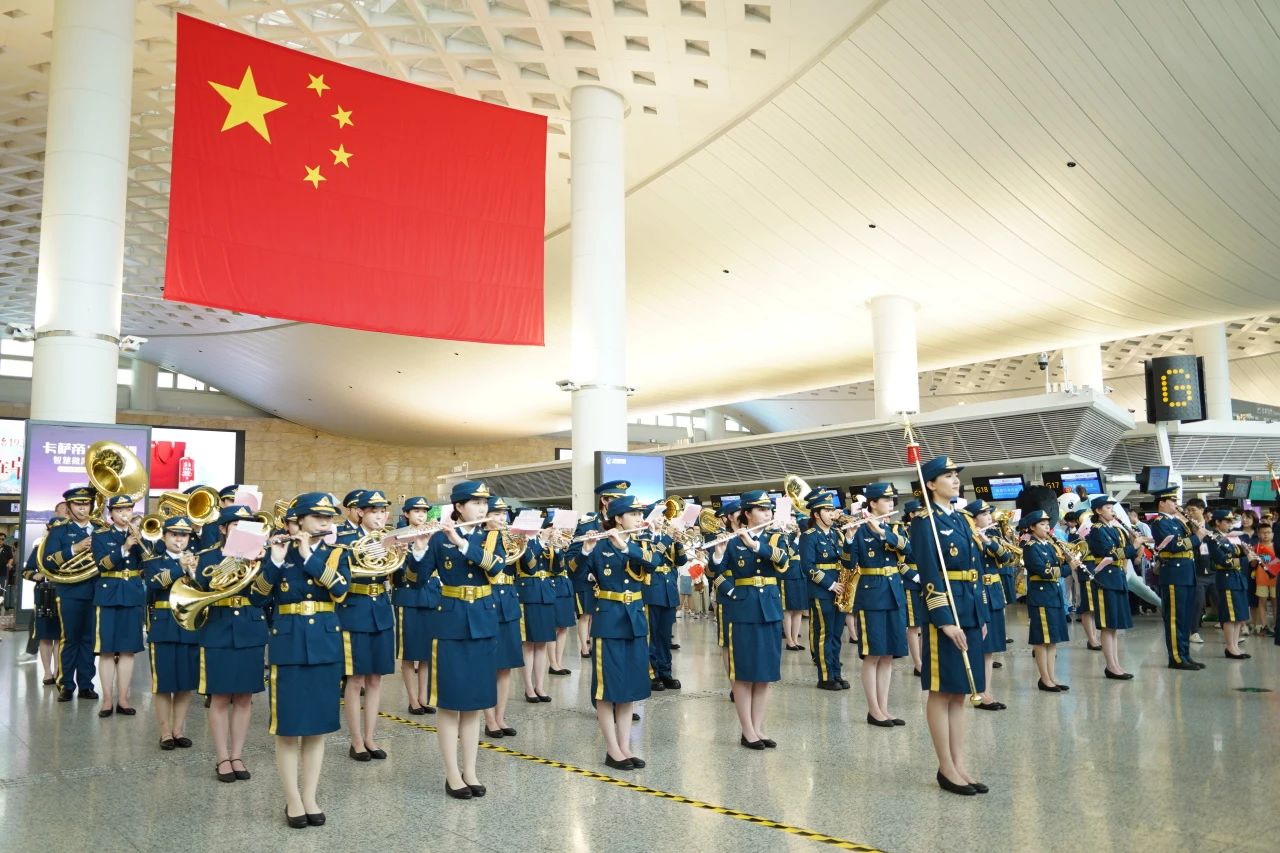 隨后,在一群吉祥物的簇?fù)硐拢恢Ч軜?lè)演奏隊(duì)伍緩緩走來(lái),從杭州機(jī)場(chǎng)T3出發(fā)層巡游至交通中心,又巡游至T4出發(fā)大廳。隊(duì)伍所到之處,一路歡聲一路歌,流動(dòng)的音樂(lè)將對(duì)祖國(guó)母親的祝福傳遞至杭州機(jī)場(chǎng)的每一個(gè)角落。